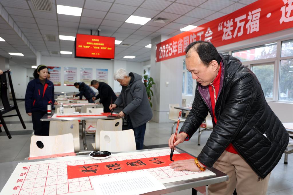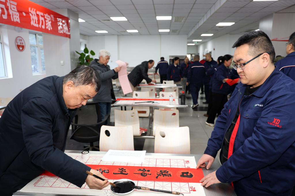 在送春聯(lián)現(xiàn)場,書法家們揮毫潑墨、筆走龍蛇,聞訊而來的職工紛紛圍在書桌旁期待成品。一停一頓、一起一落,一句句散發(fā)著清新墨香的吉祥語句躍然紙上,“一元二氣三陽泰,四時五福六合春”“春滿乾坤千里秀,時逢盛世萬家興”,一副副滿載美好祝福的春聯(lián)和“福”字躍然紙上,既有辭舊迎新的熱切祈盼,也有對幸福生活的美好祝福。職工們拿到寫滿祝福和美好祝愿的春聯(lián),喜悅之情溢于言表?;顒悠陂g共送出春聯(lián)近400余幅,福字300余幅。